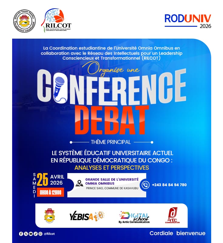 Prévue le samedi 25 avril 2026 dans la grande salle de l’Université Omnia Omnibus, la rencontre réunira étudiants, chercheurs, enseignants, décideurs publics et acteurs de la société civile autour du thème : « Le système éducatif universitaire actuel en RDC : analyses et perspectives ».