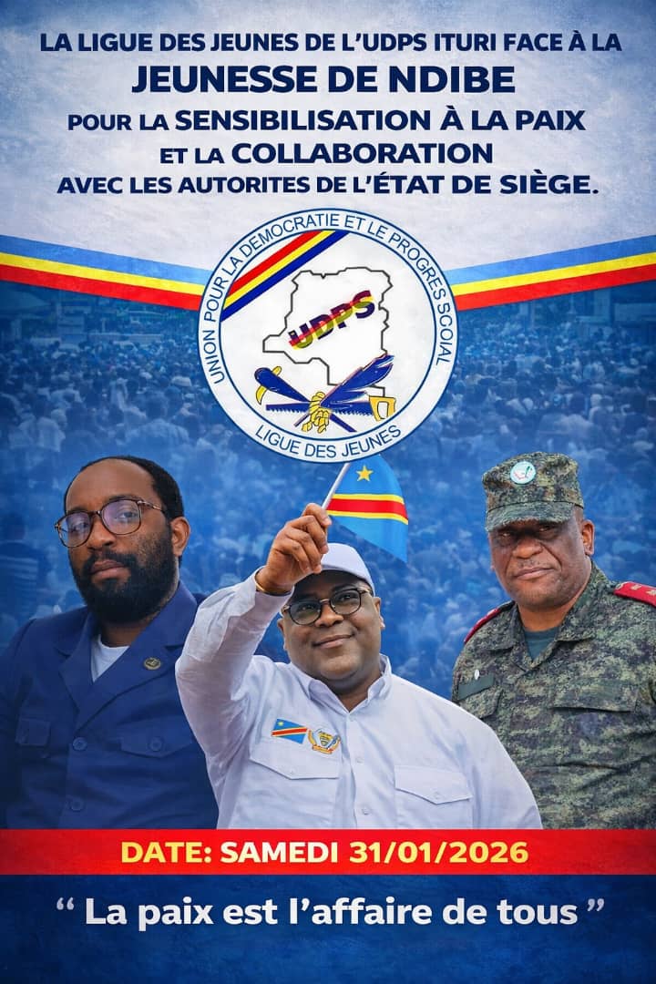 Une fois n’est pas coutume. Dans un message partagé ce mardi 13 janvier 2026, Me Michel Mulumba, cadre de la jeunesse de l’UDPS Ituri, a annoncé la tenue d’un meeting dans le quartier Ndibe, en date du 31 janvier 2026. Objectif : sensibiliser la jeunesse iturienne à la paix, de commun accord avec les autorités de l’État de siège, qui se sont toujours montrées favorables à toute initiative allant dans le sens du rétablissement de la paix.