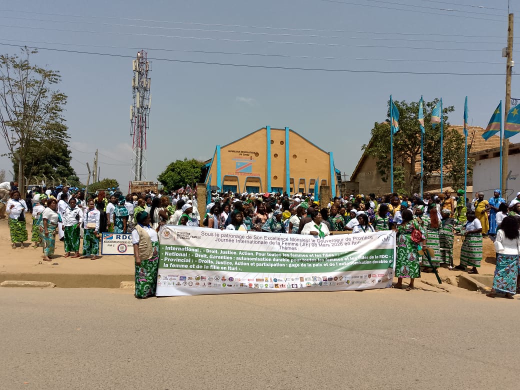 La cour de l’Assemblée provinciale de l’Ituri a servi de cadre au rassemblement de plus de mille femmes issues de plusieurs associations, d’organisations internationales comme nationales, pour célébrer la Journée internationale des droits de la femme organisée par la Division du Genre et de la Famille, avec le soutien du Gouverneur militaire de l’Ituri.
