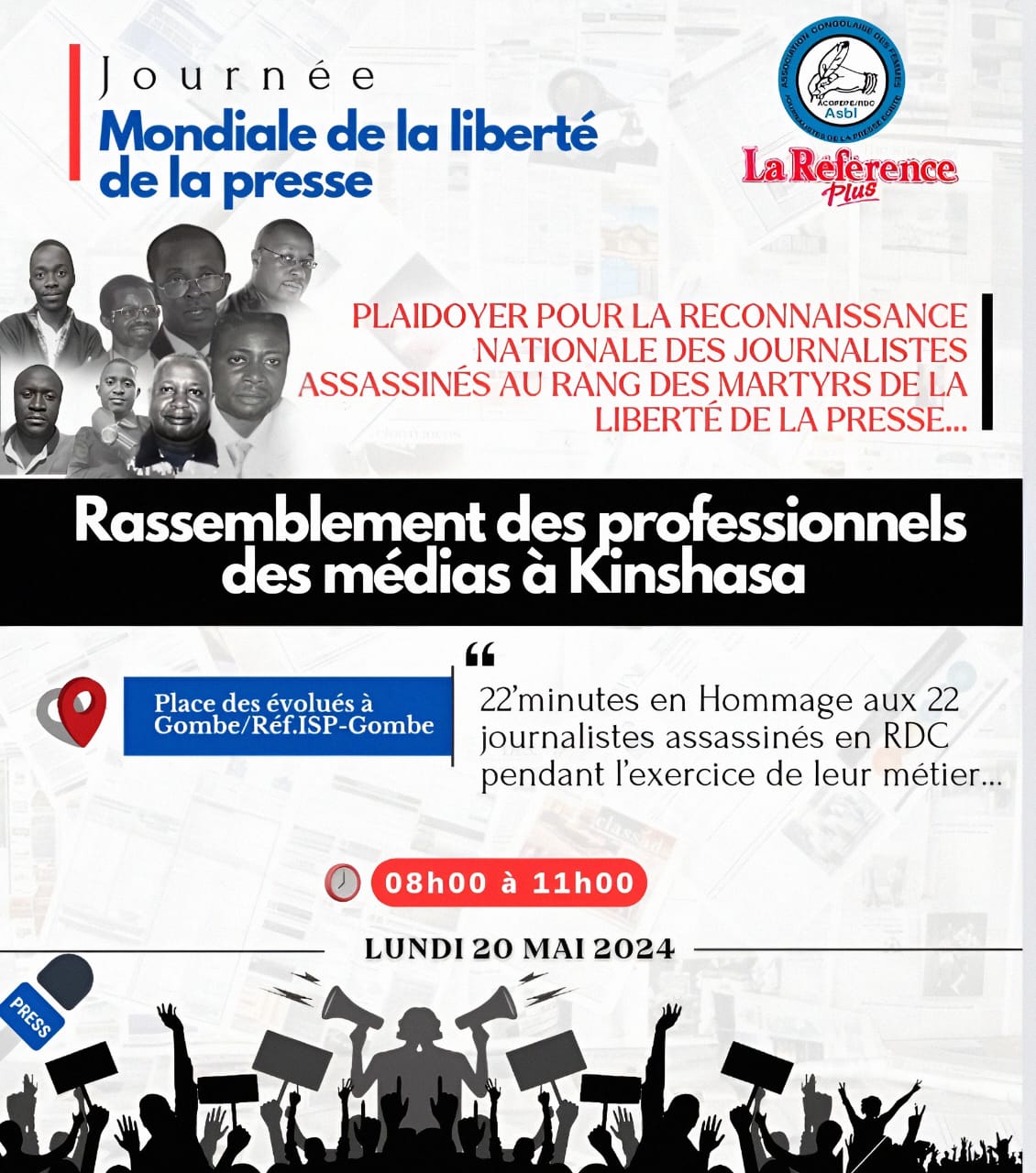 Kinshasa, 07 mai 2024 – L’Association Congolaise des Femmes Journalistes de la Presse Écrite (ACOFEPE), en collaboration avec le quotidien la Référence Plus et les organisations professionnelles des médias et de défense des droits de l’homme, lance un appel à la solidarité des professionnels des médias et des défenseurs des droits humains afin de rendre hommage aux 22 journalistes assassinés en République Démocratique du Congo.